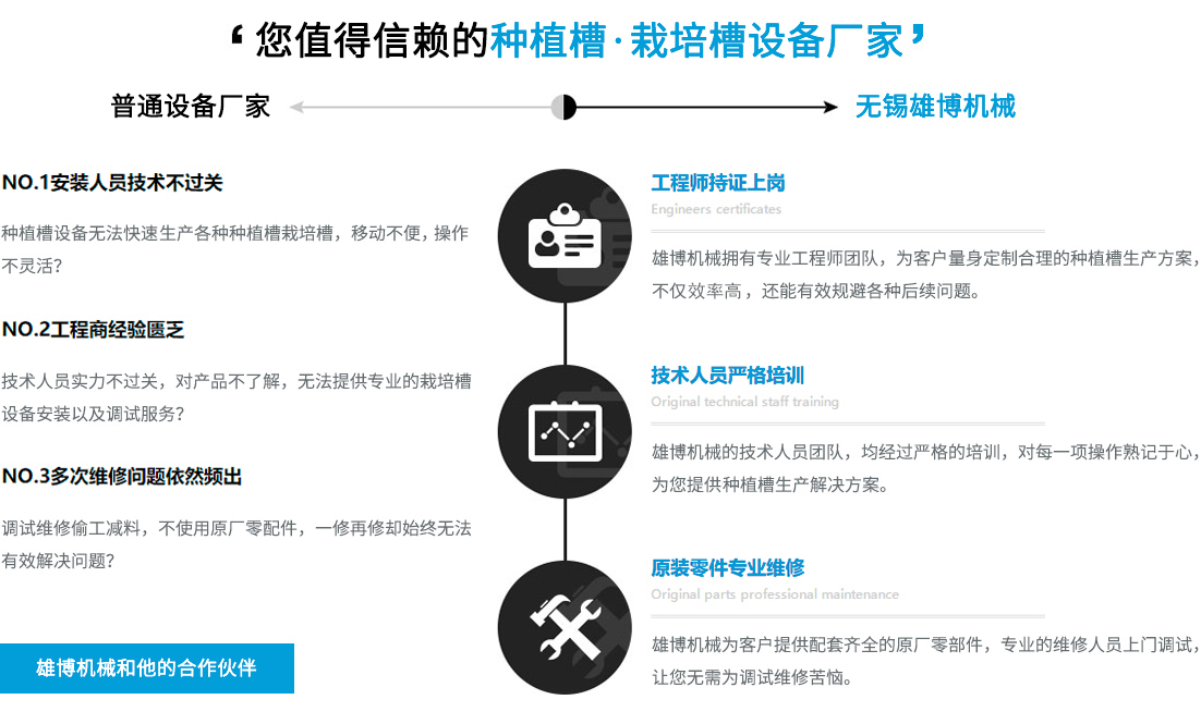 您在選擇雄博產(chǎn)品的同時,也選擇無微不至的終身服務??筛鶕?jù)不同客戶實際需求進行種植槽設備,栽培槽設備等的特殊工藝設計制造專業(yè)一對一售前/售后/技術咨詢指導,享受更貼心/放心的設備使用體驗。